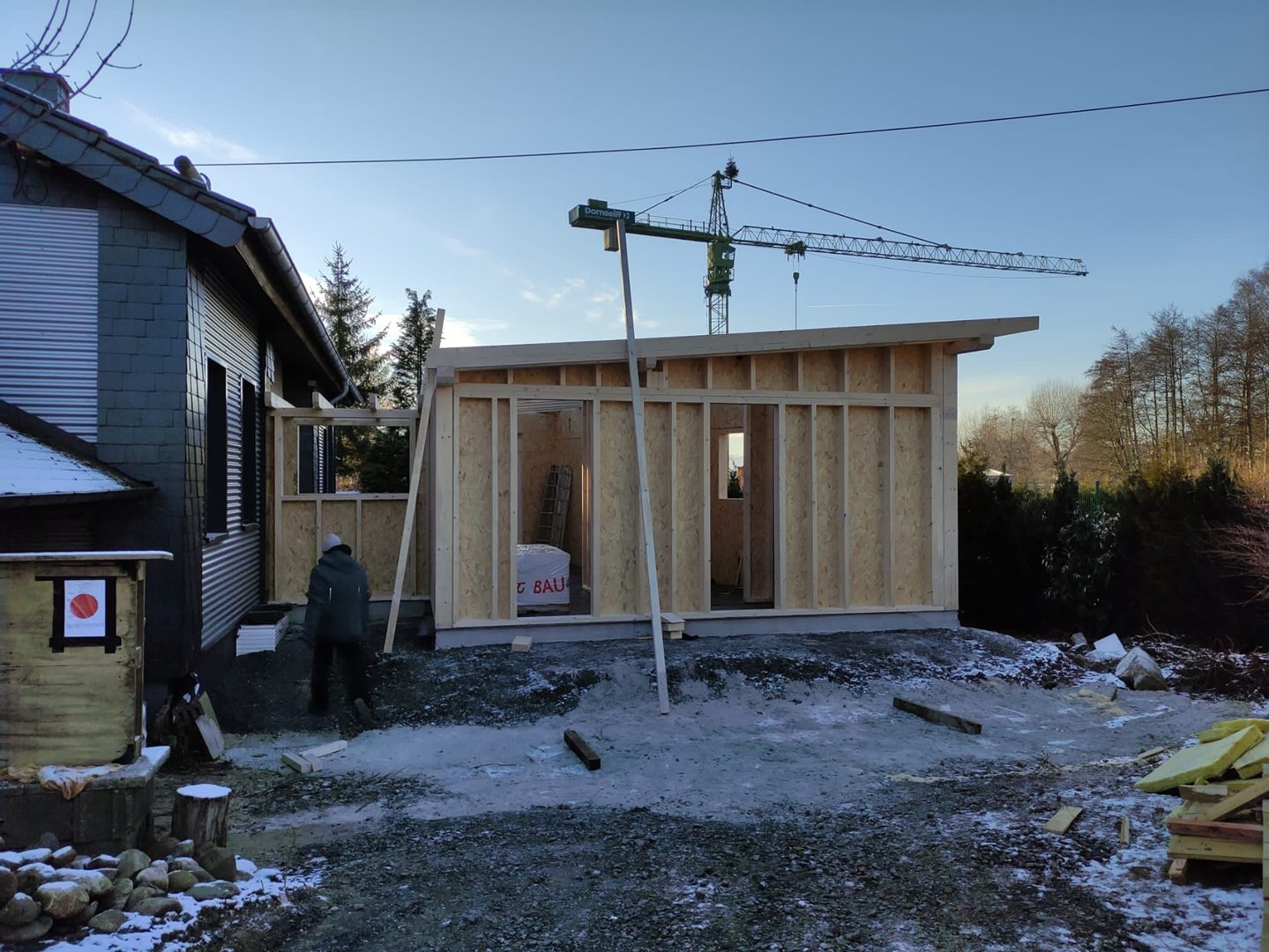 Durch diesen Übergangsbereich grenzt sich der neue Baukörper klar und funktional vom Haupthaus ab, ohne dessen Struktur zu verändern. Gleichzeitig fügt sich der Anbau durch seine Form und die angepasste Dachneigung harmonisch in das Gesamtgefüge ein.