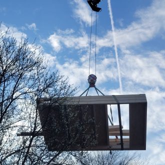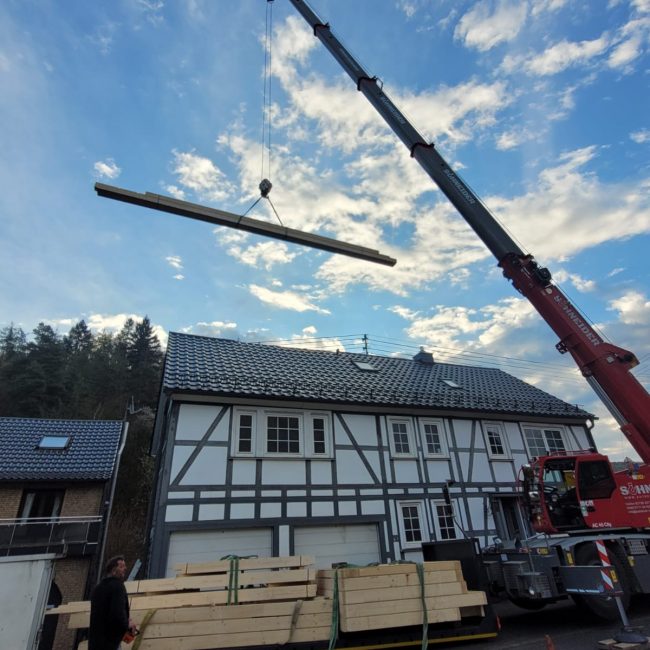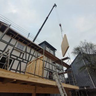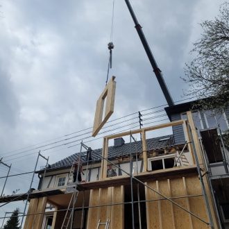 Die vorgefertigten Elemente wurden mit Hilfe eines Autokrans über das bestehende Wohnhaus gehoben und dort montiert.