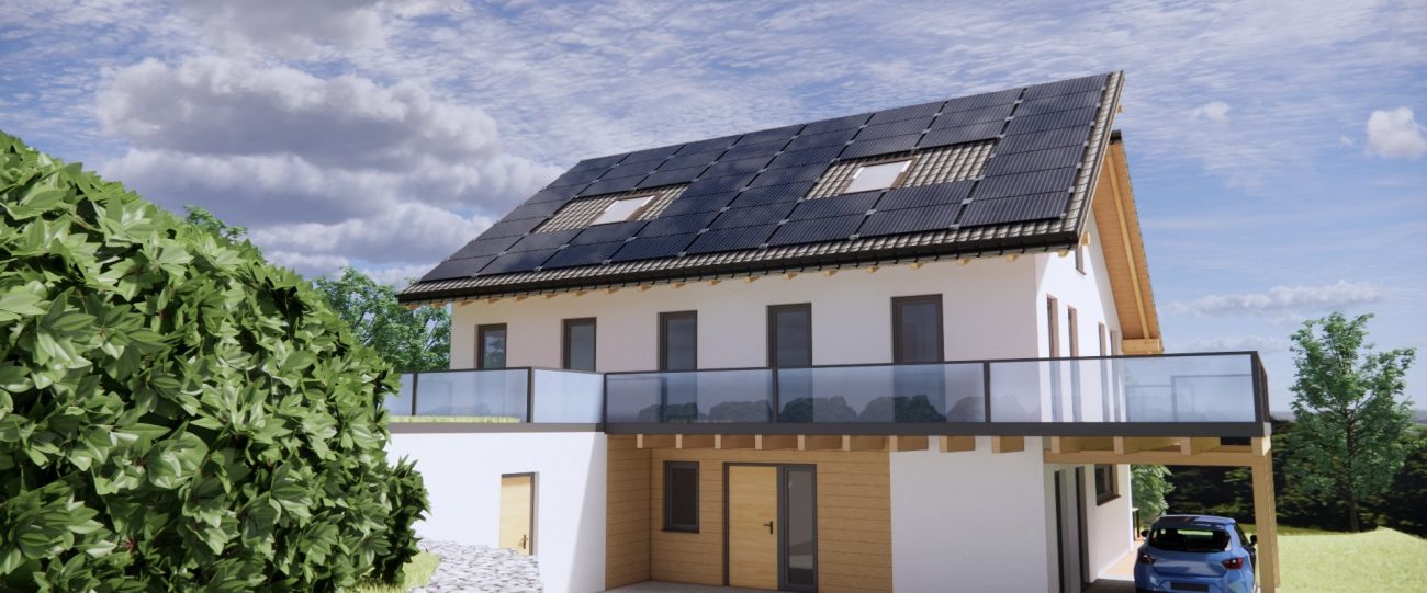 Wohnhaus mit Keller und Carport. Im Innenraum sind Decken sowie Dachflächen als Sichtkonstuktion ausgeführt. Entwurf fertiges Objekt – außen fertiges Objekt – Innen Bauphase