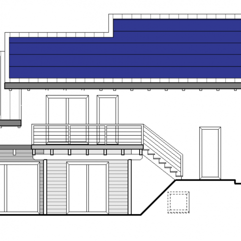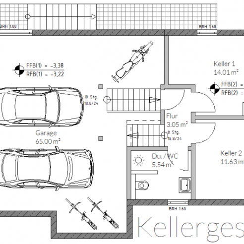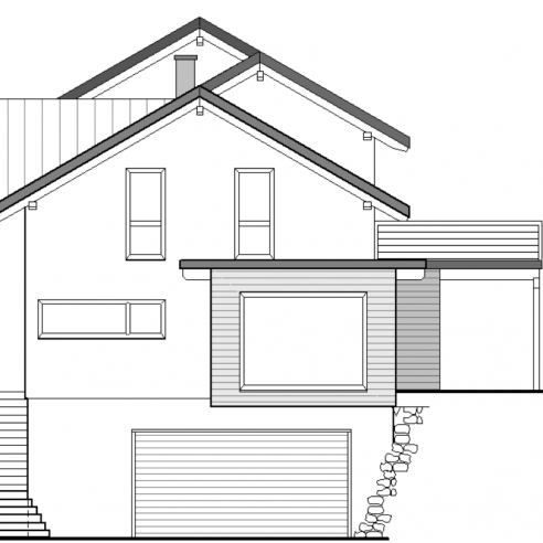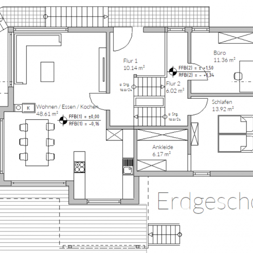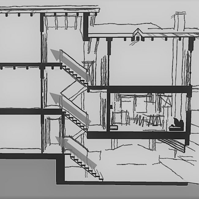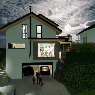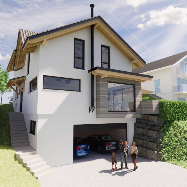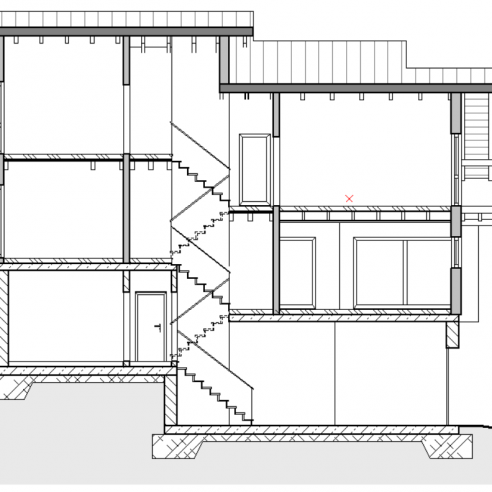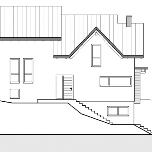 Ein relativ schmales Grundstück mit einem stark ansteigenden Gelände von fast 8 Metern – Da kam schnell die Idee eines sogenanneten „Split-Level-Hauses“ auf. Die jeweiligen Geschosse versetzen untereinander in der Höhe, sodass das Gebäude praktisch mit dem Gelände in die Höhe wächst.