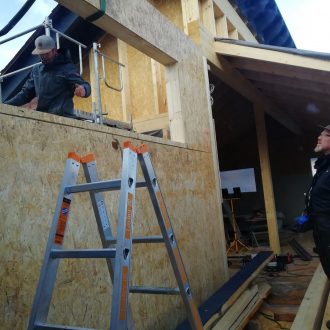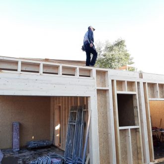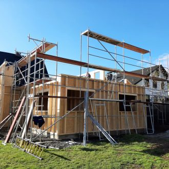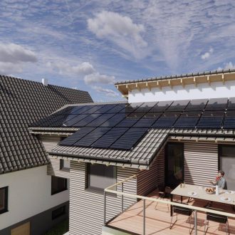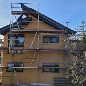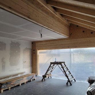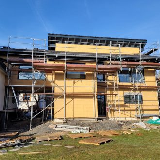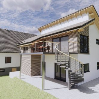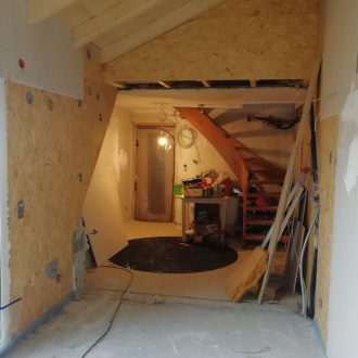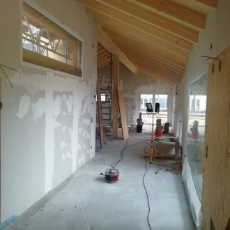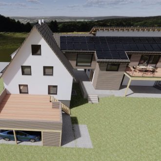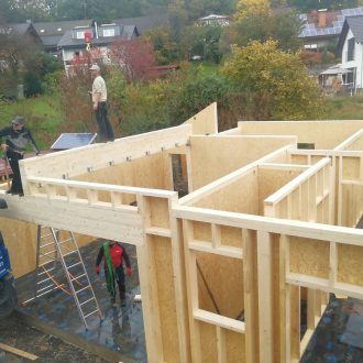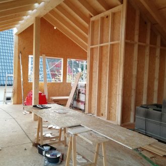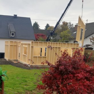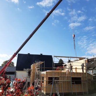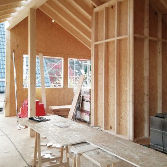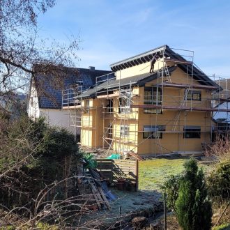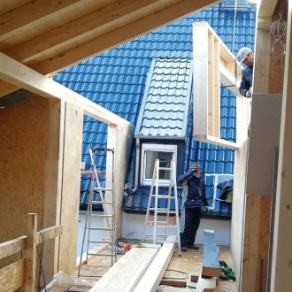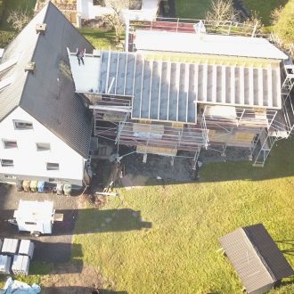 Erst wurde der Neubau gestellt und dann das Bestandsdach für den Verbindungsgang zurück gebaut – so wird das Obergeschoss des Anbaus mit dem Dachgeschoss des bestehenden Wohnhauses verbunden.