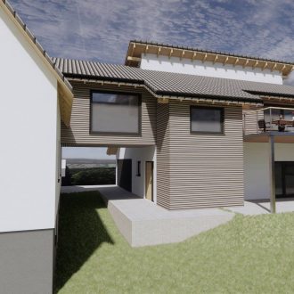 Die Idee war das Bestandshaus mit dem Neubau durch einen Gang zu verbinden. So bleibt die Kubatur des 50-er Jahre Hauses erhalten und es entsteht trotzdem eine Verbindung zu dem Neubau.