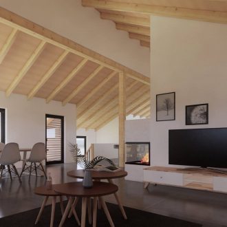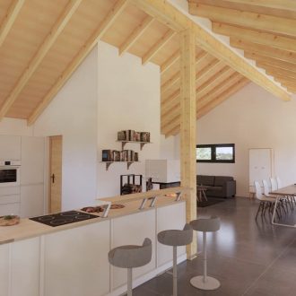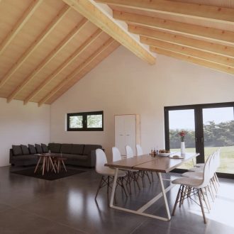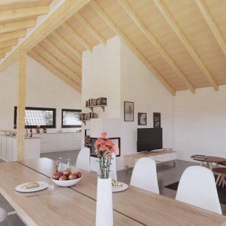 Eine sichtbare Holzkonstruktion lässt auch von Innen den versetzen Dachstuhl erkennen.
